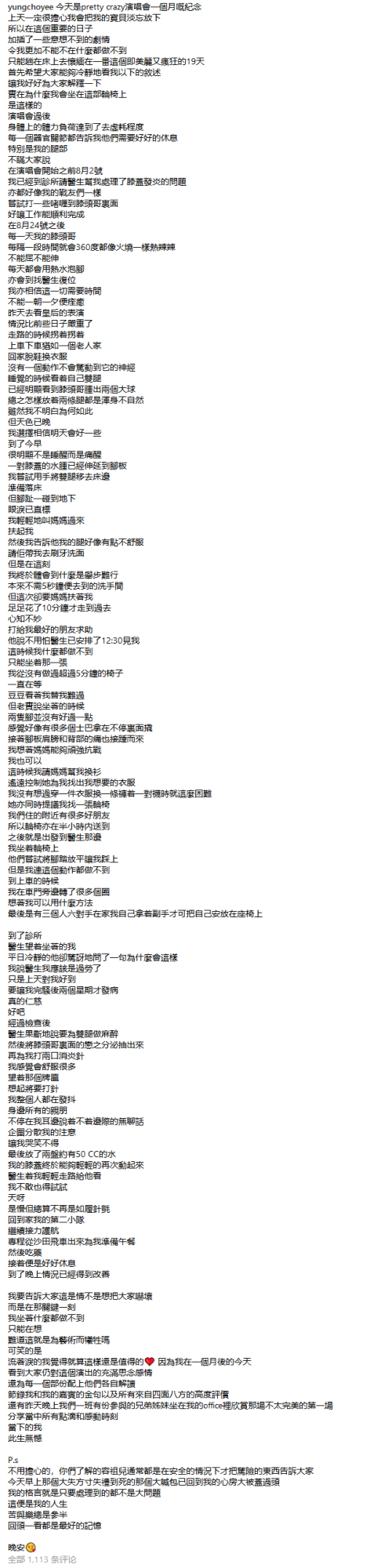 Yong Zuer写了一篇长文来描述他这几天的经历,让粉丝们可以放心,他的腿不浪费,经过休养,他仍然可以站起来继续表演唱歌和跳舞。看来明星不容易,也要在自己的生活中奋斗。