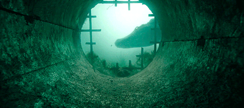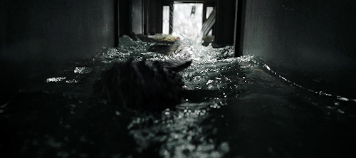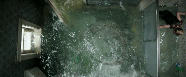 因为飓风的暴雨一点一点地侵入地下室的有限空间,擅长在水下移动的鳄鱼占了上风,人类生命被潜伏在水下的致命和未知的不确定性慢慢侵蚀。