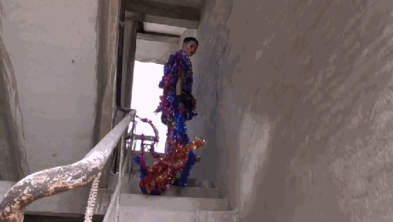 此外,泸县的影片都充满了令人惊奇的事情。残破的渔网,橡胶手套,叶,蚊帐,像什么,都可以成为他的时装表。