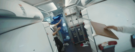 在机舱,氧气面罩在乘客座位上方所有脱落由于机舱压力缓解。乘务长邲嗯黯带领全体船员安抚乘客一边喊着给大家:“不要惊慌,相信剧组,我们将能够把你安全着陆。”