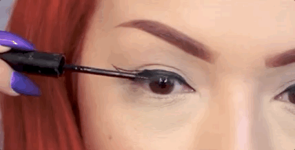 同样重要的是,在任何时候打开你的眼睛检查眼线尾部的位置。绘制的基本框架到镜和找到的角度。然后填写眼尾。