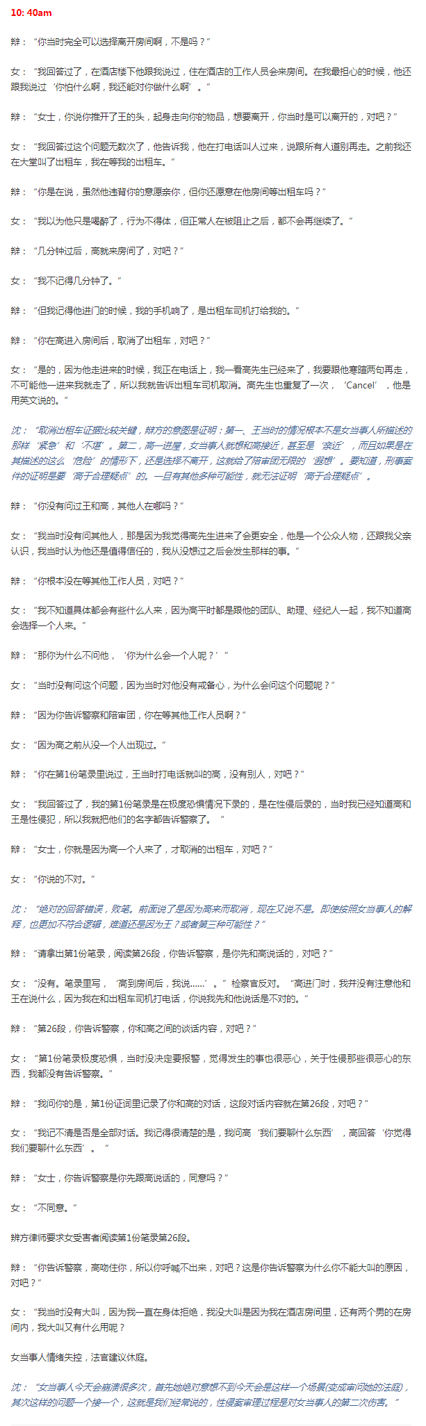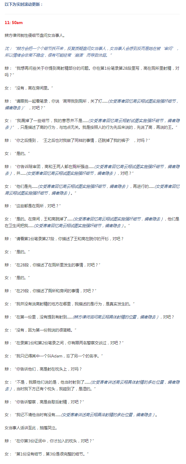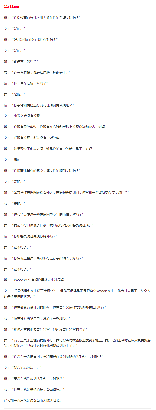 律师高云翔交叉检查的女客户反复和高云翔的SJ的位置。女性客户的回答显然是有缺陷的,这是从以前的证词完全不同。该女客户选择使用“不记得了”来解释一些关键问题,但前女客户说,她有什么事,当晚深刻的记忆,并表示一些强迫行为“很明显是要记住, “很明显的是,女客户就是讲,她是被迫的,不是自愿。