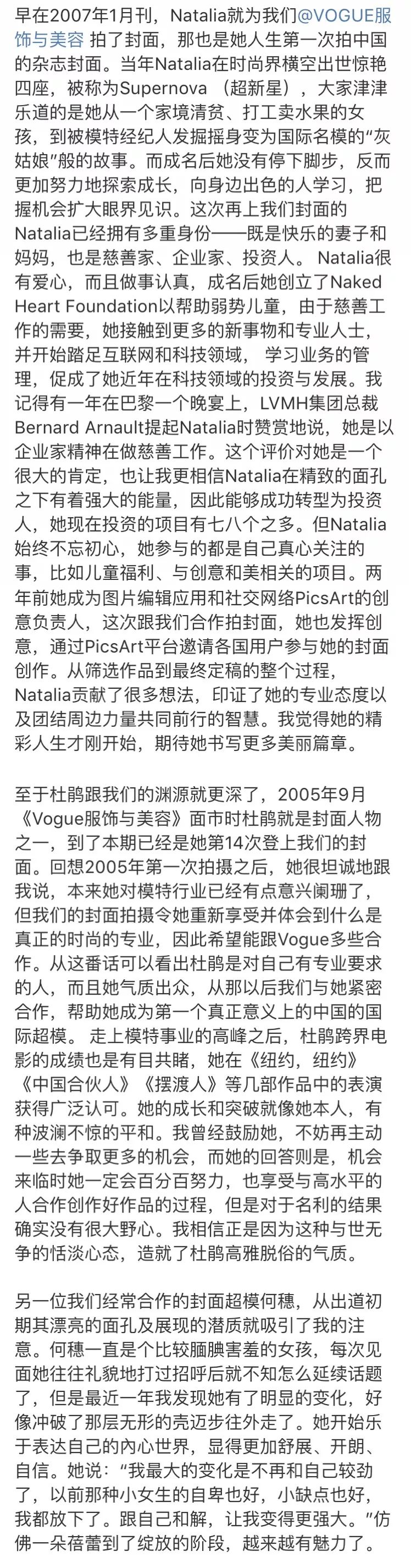 主编张宇在微博上写了很长的一段话,讲述Vogue和三位超模的的缘分,喊了众多明星帮忙转发。