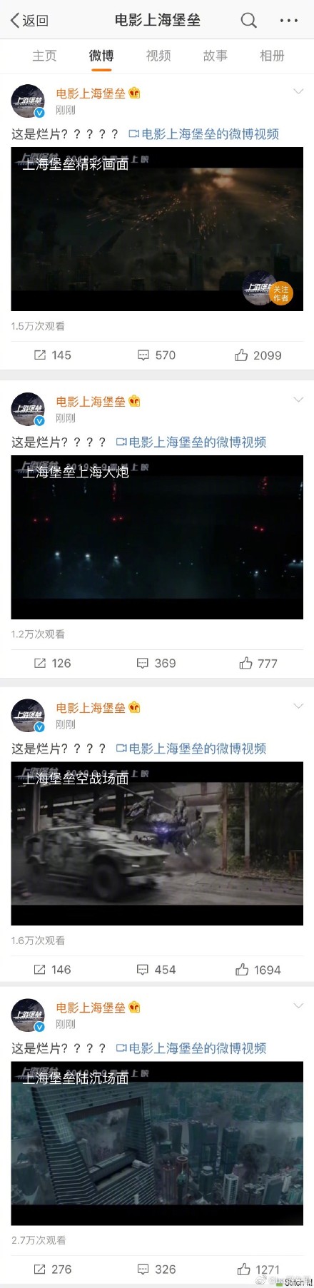 《上海堡垒》票房下滑口碑来到冰点,制片方《上海堡垒》官博昨日更是连发多条同样内容的微博,反问观众:“这是烂片?”,可以说《上海堡垒》惨淡票房让制片方都坐不住了。