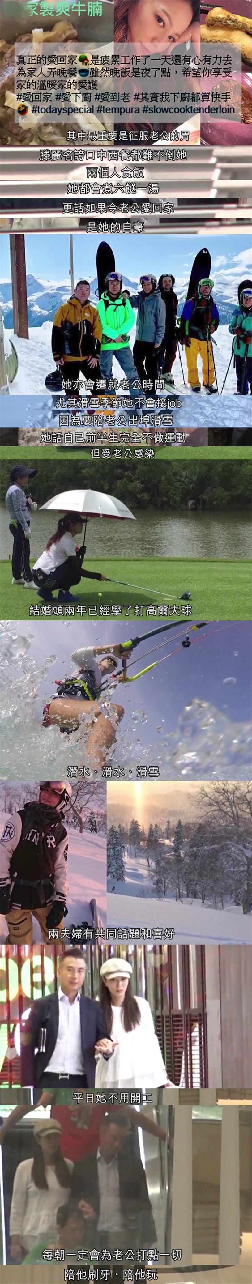 以前她只会工作不运动,自从和老公结婚后她也爱上了运动。高尔夫、滑雪、潜水等等都会了,还考了相关的牌照,夫妻俩有共同的话题。她在冬天还会迁就老公的时间,陪老公一起去滑雪。平常她不用拍戏时每天早上都会帮老公打点一切,陪他刷牙、陪他玩,她很享受现在当老婆的感受。