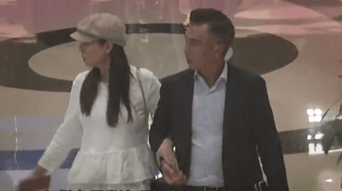 滕丽名和老公买完东西后一人提着一袋战利品,腾出手来紧握对方,女神和老公之间充满默契。