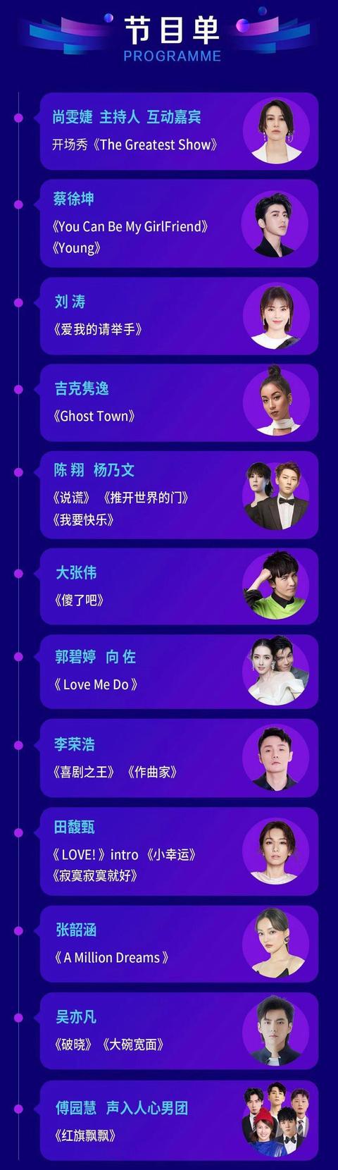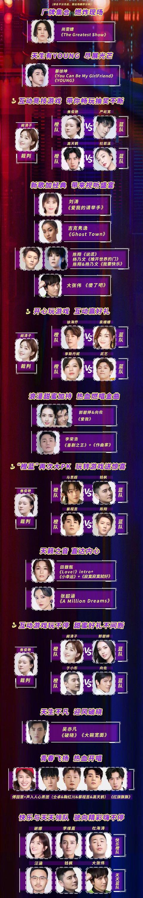 尚雯婕担任开场嘉宾,她是湖南卫视综艺节目《声入人心》的导师;压轴的是声入人心男团成员:高天鹤、仝卓、鞠红川、蔡程昱。蔡徐坤和吴亦凡的粉丝略微有点失望,觉得被湖南卫视低估了。